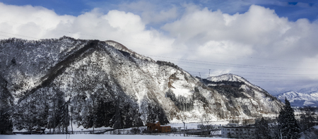 white snow and beautiful landscape during winter season in Japan against blue sky background