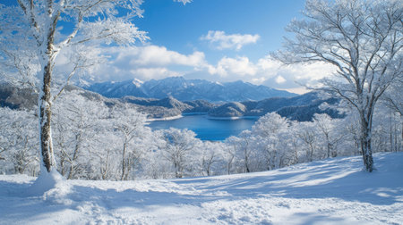 Snow-capped hills of Kurumayama Plateau in winter, with Lake Shirakaba visible in the distance, surrounded by frost-covered trees.