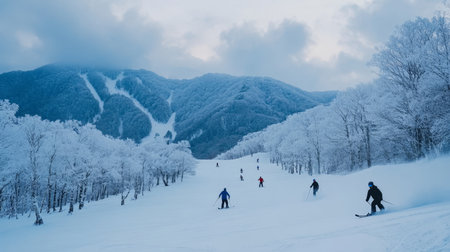 Skiers enjoying thrilling runs on snow covered mountain slopes in winter wonderland