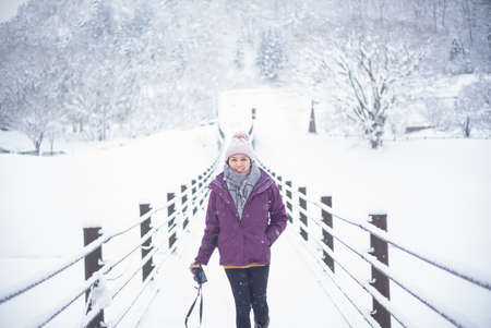 Smiling young Asian woman holding camera walking on snow wooden bridge in winter forest in frosty weather and looking at camera, travel trip at white bridge in Shirakawago village at Gifu, Japan.
