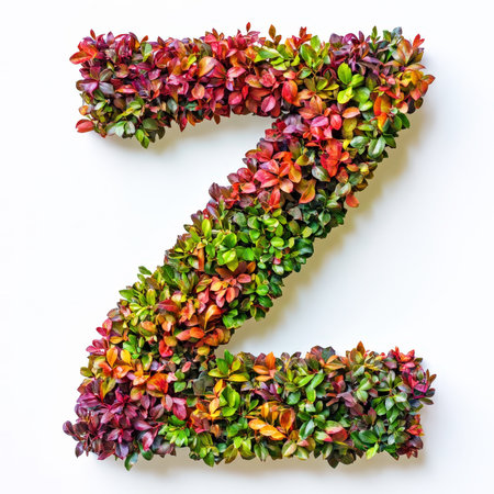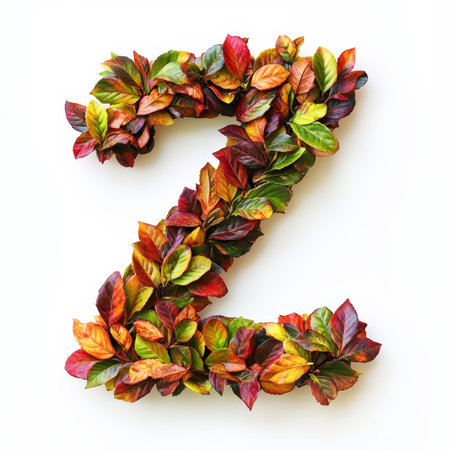 Alphabet letter Z made of fall leaves, flowers. berries. Vibrant autumn colours. White clean background. Generative AI.
