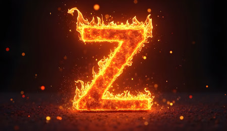 Flaming letter Z emerging from darkness, covered in roaring red and gold flames