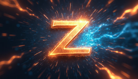 A striking letter Z radiates with vibrant orange and blue hues, surrounded by electrifying sparks and energy waves. This visually captivating image embodies a sense of power and creativity, perfect for tech-themed projects or branding.