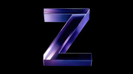 A single letter Z is presented in a three-dimensional rendering. It exhibits reflective surfaces with gradients of purple and blue hues. The composition is isolated against a black backdrop, suggesting a studio setting, suitable for various design and advertising projects, offering potential use in branding or editorial content.