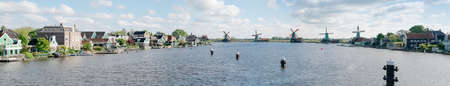 Zaanse schans, Netherlands - April 1, 2016: Panoramic view of windmills in Zaanse Schans, traditional village in Holland