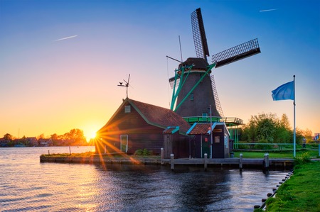 Zaanse Schans village, Netherlands. Dutch windmill and traditional house at sunrise.