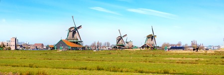 Panoramic view of windmill in Zaanse Schans, traditional village in Holland, blue sky, copy space