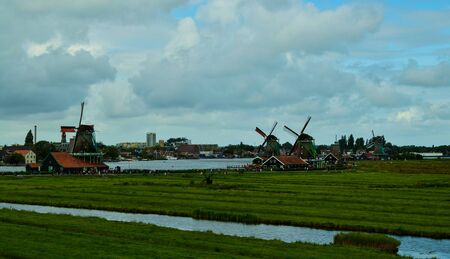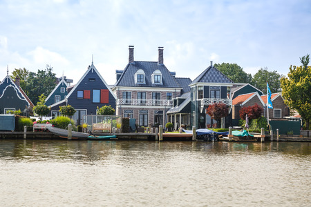 ZAANDAM, NETHERLANDS - JULY 4, 2016 : View of traditional small village houses in farm on cloudy sky. Zaanse Schans is popular with windmills.
