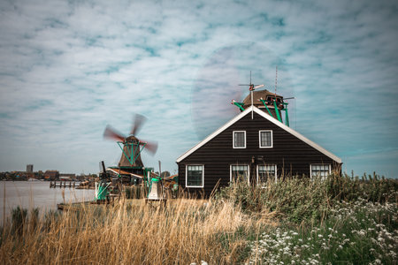 Vintage style of traditional Dutch Windmills and cottages in Zaanse Schans.