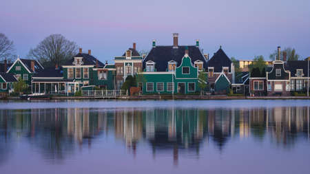 Traditional residential buildings at dawn along the river in Zaandijk, Netherlands