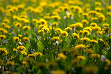 Yellow dandelion flowers on a green meadow in the sunny daylight.