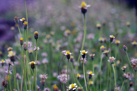 A meadow with a lot of illuminated yellow dandelions with natural light on sunset with forest on background. Dark close up shot of a several dandelions in the high green grass on the field on sunset.