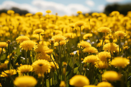 The beauty of a vibrant field of yellow dandelions blooming amidst green grass on a sunny summer day. Nature's beauty, seasonal change, and the fleeting nature of life.