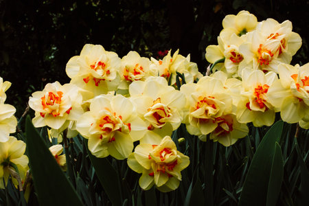 Narcissus terrycloth Tahiti yellow flowers with bright red center. Bright fresh narcissus buds on a dark background. Growing bulbous plants in a garden, orchard in spring. flower head wallpaper.