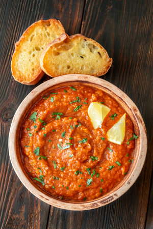Appetizer of baked pepper ajvar in a bowl on a dark background. View from above
