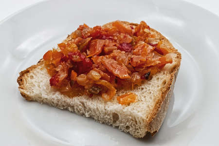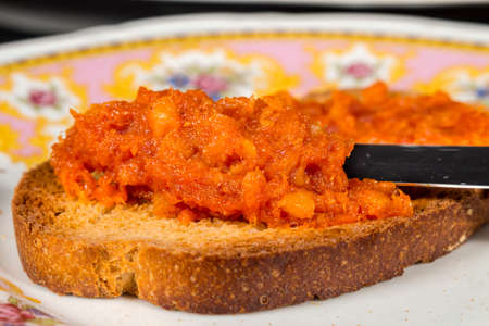 Slice of bread with chutney in a painted ceramic plate. Traditional Bulgarian breakfast.