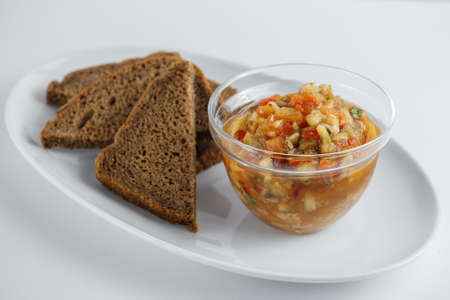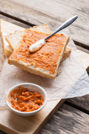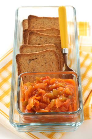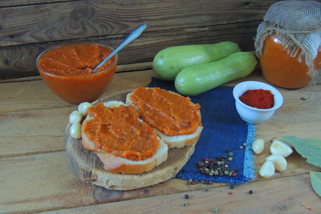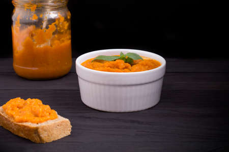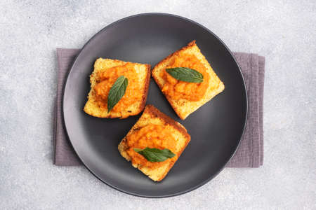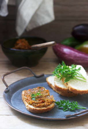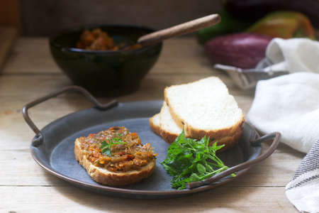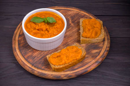 Toasted bread with vegetable caviar, made of squash, pumpkin, tomato, carrot