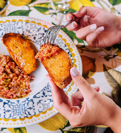 Spread sobrassada on toast, typical Majorcan sausage