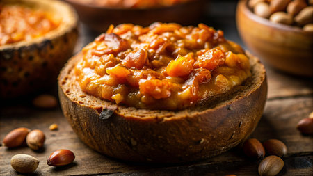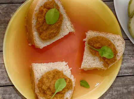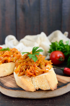 Squash caviar on a crispy baguette on a dark wooden table. Sandwiches with stewed vegetables. Vegan appetizer.
