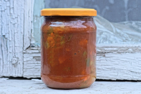 one closed glass jar with red lecho stands on a white table on an autumn street