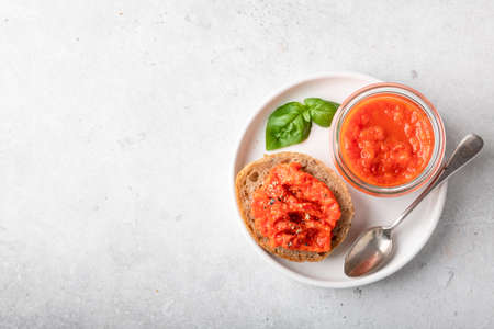 Slice of rye bread and homemade pasta ajvar. Vegetable sauce or caviar of baked red bell pepper on grey. Balkan appetizer cuisine. Horizontal orientation. Space for text. Top view.