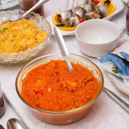 Ljutenica, vegetable relish or chutney. Bulgarian, national cuisine, Traditional assorted Balkans dishes, Top view.