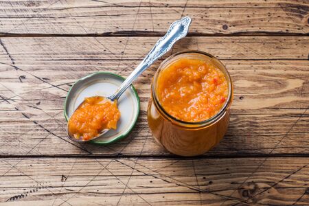 Closeup image of carrot jam in a glass jar with wooden spoon on blue background. Image with copy space, top view