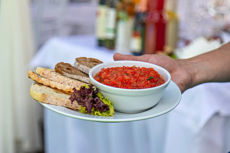 Spicy appetizer ajvar on pieces of bread and in bowls on the table. vertical view