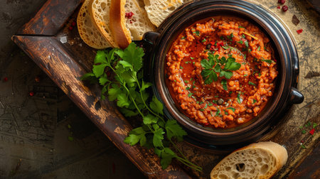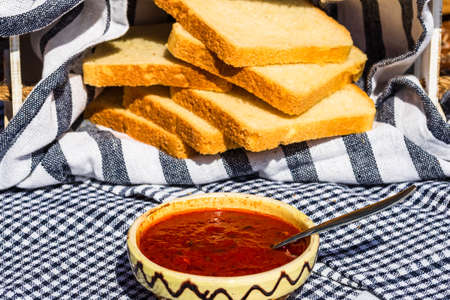 Bowl with tomato sauce with slices of toast bread in background in a rustic composition.