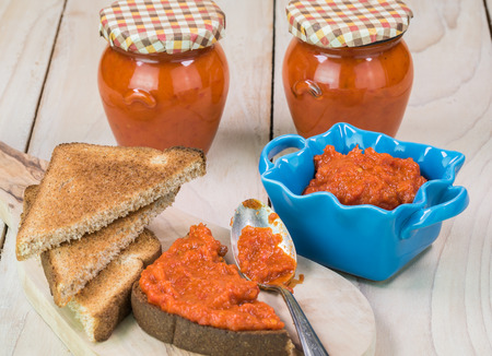 Ajvar, Lutenitsa, Pinjur, Harissa with bread on a plate. Close-up
