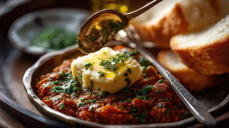 A delectable tomato dish topped with creamy herb butter, accompanied by slices of fresh bread, styled on a rustic wooden table for a cozy presentation.