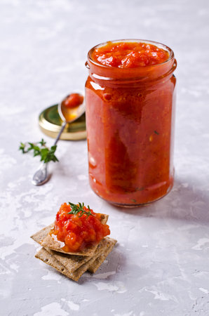 Jars of tomato sauce with chili, pepper and garlic. Bolognese sauce, lecho or adjika. Preservation. Canning.