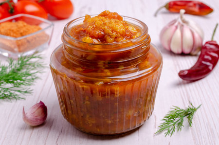 Homemade spicy chili sauce in a glass jar on a dark background. AI generated ajvar made from sweet bell peppers and eggplants.