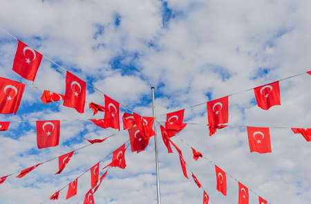 Beautiful blue and white sky with many red turkish flags hanging. Horizontal color photography.