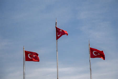 Many national Turkish Flags on the masts against the blue sky. National sign of the country