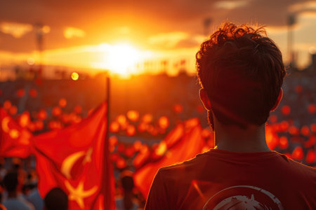 Turkish flag waving gracefully in the wind at sunset, with a mosque silhouette in the background, celebrating the rich culture and deep-rooted traditions of Turkey against a stunning evening sky