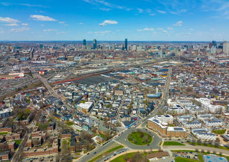 Aerial view of Boston city, bridges and river with skyline in sunlight. g.