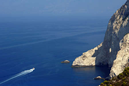 Cruise around Zakynthos, landscape view from the sea on the island, Greece. small motor boat rocking by waves