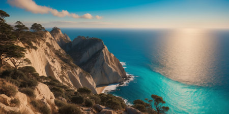 AI Generated. A Breathtaking Panoramic View of a Secluded Bay Nestled Amongst Dramatic Cliffs and the Azure Ocean Under a Summer Sky