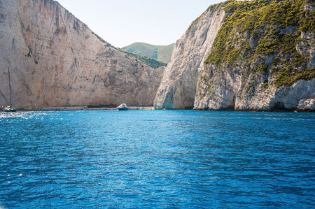 Rock Cliffs in front of Navagio beach Zakynthos. Shipwreck bay with turquoise water and white sand beach. Famous marvel landmark location in Greece