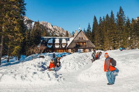 Tatra Mountains, Poland, February 14, 2015: group of tourists sit in front of a mountain hut and enjoy the sun, Koscieliska Valley, Poland
