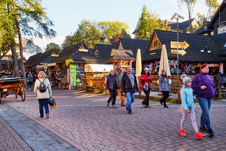 ZAKOPANE, POLAND - September 29, 2018: People on street for tourist walking and promenade in the city center in Zakopane in Poland