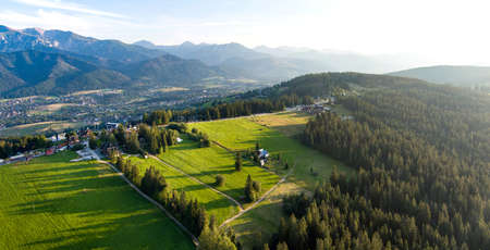 Aerial view of Zakopane town underneath Tatra Mountains taken from the Gubalowka mountain range. High mountains and green hills in summer or spring. Scenic mountain view in Poland.
