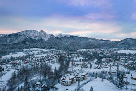 Polish mountains Tatry in Zakopane. Zakopane city in winter time in Poland. Tatry mountains aerial drone photo view