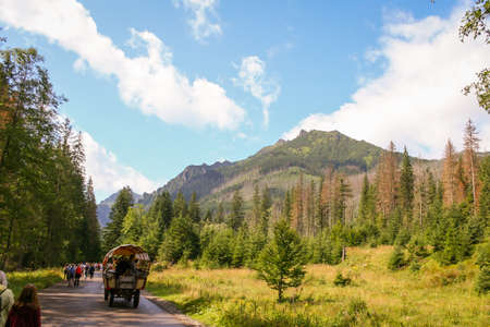 TATRA, POLAND - July 4, 2015: National Park in the Tatra Mountains, Dolina Rybiego Potoku, Wlosienica near Zakopane, horse carts ride, transport to Morskie Oko alpine lake attraction for lazy tourist.