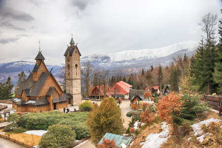 KARPACZ, POLAND - MARCH 09, 2020: Old wooden temple Vang (Wang). Medieval Norwegian stave church which was transferred from Vang in Norway and re-erected in 1842 in Karpacz, Poland, Europe.