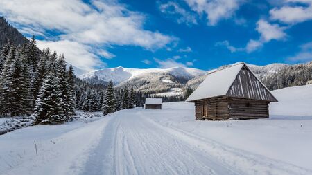 Snowy wooden cottages in winter at sunrise, Tatra Mountains, Poland