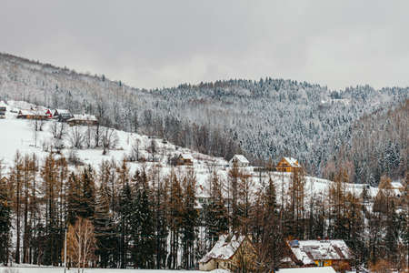Winter season in Zakopane, Poland. Snow covered houses roads and forest with mountains in the background. High quality photo