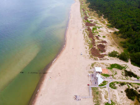 Aerial view of the Baltic Sea shore line near Klaipeda city, Lithuania. Beautiful sea coast on chilly autumn day. Autumn on Baltic sea.
