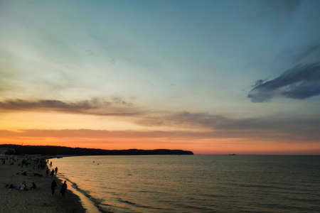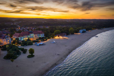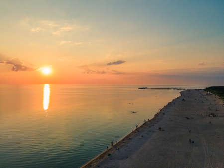 Aerial view of sunset over the sea in Palanga, Lithuania. Sandy coastline with the bridge to the sea